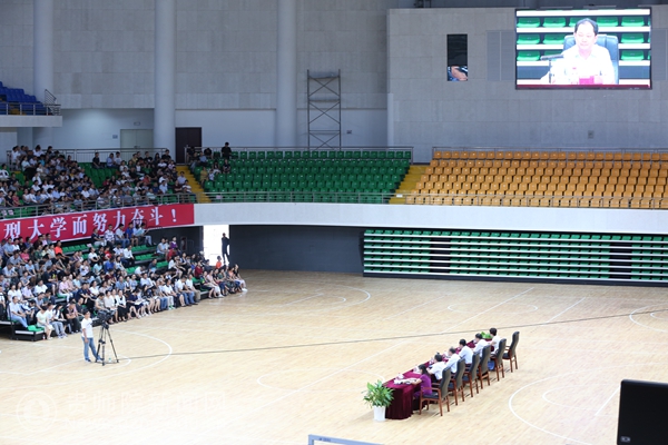 本网讯 8月18日下午,best365在体育馆隆重召开新学期全体教职工大会,安排部署新学期工作,全体在家校领导出席大会,副校长令狐荣锋主持大会。