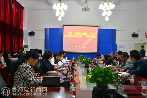 本网讯 5月16日上午,学校在第一会议室召开“修订《岗位说明书》和推选岗位聘用人员”工作说明会。副校长令狐荣锋出席会议;各学院院长,各部门负责人参加会议。会议由人事处处长刘俊伶主持。