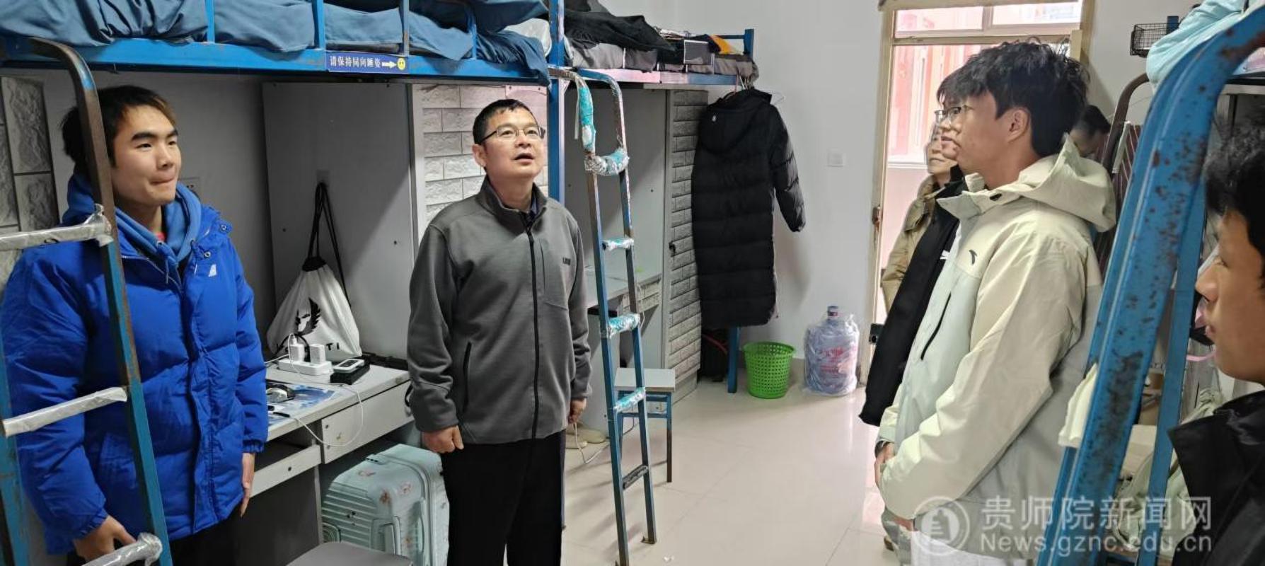本网讯 为深入贯彻党的教育方针,落实立德树人根本任务,11月19日中午,校党委常委、副校长陈真波率领体育学院汤士波、刘华伟、刘丽娟一行,深入诚园男生宿舍进行走访调研,实地了解学生思想、学习、生活状况,送去学校的关怀与温暖。