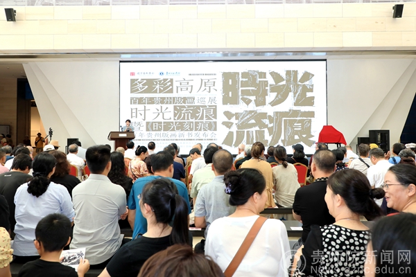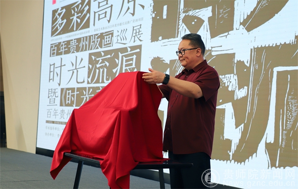 在开幕仪式的尾声,贵州出版集团党委书记黄定承为《时光刻痕——百年贵州版画》新书首发揭幕,贵州省政协原副主席班程农为“多彩高原·时光流痕——百年贵州版画巡展”贵阳首展揭幕。展览团队引导专家共同观展,在艺术的世界里感受贵州魅力。