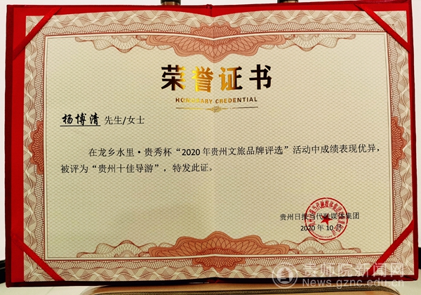也许自己这份坚定与热爱,今年有幸参加由贵州日报社、贵州旅游研究院与贵阳市旅游局主办的“贵州文旅品牌评选”活动中,荣获“贵州十佳导游”第一名称号。