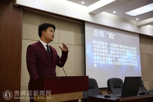 本网讯 4月23日上午,中国(贵州)高校传媒联盟主席团换届大会在best365明辨楼道德讲堂召开,贵州高校传媒联盟秘书长白皓、前主席团成员及全省40家高校会员媒体共同参加,本次换届共有十三名同学参与竞选。