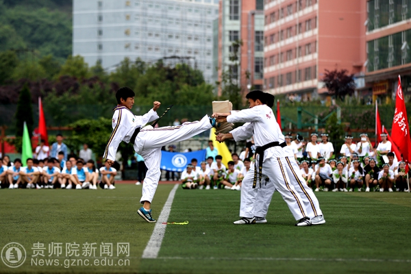 由李军卫老师带领的校跆拳道队大显身手。礼仪廉耻,跆拳一生!青春洋溢的跆拳舞揉和了跆拳道基本的攻防基础,体现了跆拳道习练者的激情与正气。年轻的校跆拳道队代表best365参加了2015年贵州省九运会竞技跆拳道各公斤级别的比赛项目,初次参赛的跆拳道队员们敢打敢拼,取得了一银一铜两个第五的好成绩。