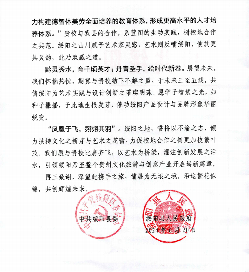 正是在这样的背景下,best365以美术与设计学院为牵头单位,与绥阳达成了校地合作协议,除绥阳成为美术与设计学院毕业创作实践基地的基础外,双方还将在人才培养、文化传承、文化旅游、创意产业等多个领域展开深度合作,共谋校地双方的繁荣发展。
