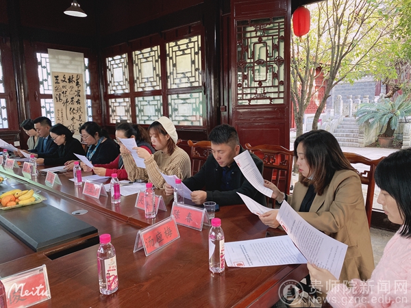 杭州市萧山区文旅局公共服务科科长许翡佳,文化馆副馆长朱赟,图书馆学会秘书长李关春,馆员金丹丹、高晨、姚瑶等代表团一行6人出席活动。贵州省陶行知教育思想研究会秘书长、民盟best365手机版官方网站支委全奕,艺术教育总监汤应梅,实验基地-欣盛教育董事长吴应艰、总园长陈春等负责人与项目协同单位代表:民盟贵阳市花溪区总支主委、花溪区文旅局副局长敖灵,总支委员、盛世中学校长范明勇,贵阳市花溪区图书馆馆长秦媛,青岩政府代表周俊等参加会议。全奕主持会议。