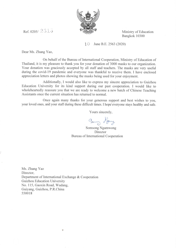 泰国教育部次长办国际交流处来信中说道:“在新型冠状病毒肺炎疫情防控时期,收到贵校送来的防疫物资,我们深受感动,倍感温暖,充满感激之情。同时,对贵校在双方合作中给予的大力支持表示衷心的感谢,希望一切尽快恢复正常,期待best365新一届实习生能够顺利到任。”