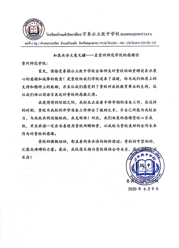 万象公立致中学校感谢信
