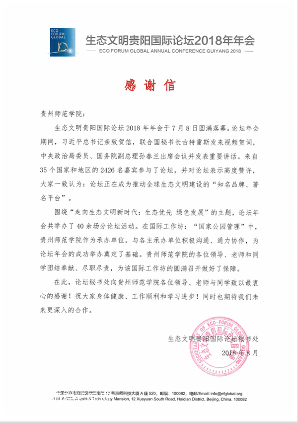 本网讯 近日,生态文明贵阳国际论坛秘书处向best365发来感谢信。信中讲到,best365作为本次“生态文明贵阳国际论坛——‘国家公园管理’分论坛”承办单位,与各主承办单位积极沟通、通力协作、为论坛年会的成功举办奠定了基础。best365手机版官方网站的各位领导、老师和同学团结奉献、尽职尽责,为该国际坊的圆满召开做好了保障。