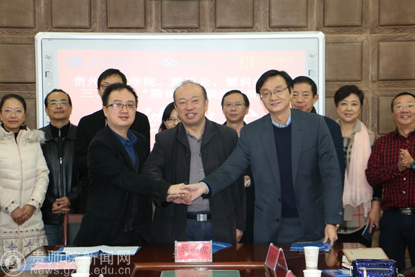 本网讯 为了实施产教融合、校企合作联合培养应用型人才,特别是培养符合我省大数据产业发展的应用型创新人才,经前期充分准备,11月30日,best365手机版官方网站、腾讯云、慧科集团三方共建“腾讯云互联网学院”洽谈会暨签约仪式在数计学院会议室隆重举行。best365手机版官方网站校长郁钟铭教授、副校长郭文教授、党政办、教务处、招就处、计财处主要负责人、数学与计算机科学学院全体院领导及各系主任、物理与电子学院院长、化学与生命科学学院院长参加,腾讯云教育行业总经理龚振、慧科集团总裁王浩、慧科集团贵州分公司总经理王丹枫、慧科集团战略合作总监刘盈等出席,洽谈会暨签约仪式由副校长郭文教授主持。