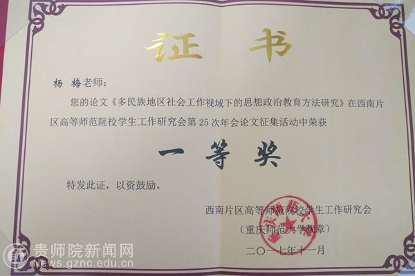杨梅论文获西南片区高师院校学工年会一等奖