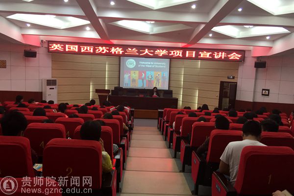 本网讯 4月19日下午,对外交流合作处在宁静楼150阶梯教室召开了英国西苏格兰大学交流生项目宣讲会,主讲人英国西苏格兰大学东亚区主管陈君女士。对外交流合作处副处长陶秀筑,地理与旅游学院、数计学院、文学院、教育科学学院、经政学院、艺术学院的学生代表参加。宣讲会由对外交流合作处处长张瑶主持。