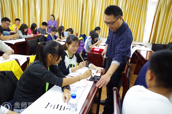 赵景飞老师在《贵州自然与人文知识》课上声情并茂地向营员们介绍贵州美丽的自然风光与多姿多彩的民族文化;卓婷老师的《汉语知识专题》通过文化拓展,讲解汉字的演变过程,随后让营员们穿上汉服,体验中国的传统文化,营员们跃跃欲试,课堂氛围十分活跃;下午,陈火青老师的《中国书法教学专题》,把新颖的书法教学理论与实践相结合,让营员们通过练习写毛笔字,体会书法的文化内涵;具有多年海外华文教学经验的徐望老师为营员们进行《汉语听说能力训练专题》的训练,徐望老师上课生动有趣,采用游戏的教学方式让营员们参与到课堂教学中,充分锻炼了他们的汉语表达能力,并通过表演的形式加深营员们对成语的理解;下午,曹月勇老师教授了《中国传统武术》,营员们在曹老师的指导下认真学习太极拳,在课堂实践中体验了中国功夫。