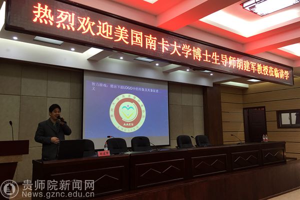 本网讯 12月16日下午,美国南卡大学的博士生导师、美国杰出青年自然科学基金获得者、南加州大学生物信息博士后、贵州大学机械学院访问教授、贵州大学英语角倡导者胡建军教授携贵州大学英语爱好者协会两位负责人同学应外国语学院繁星外语社的盛情邀请,在文韬苑道德讲堂举办了“共享、创新与英语角”专题学术讲座。讲座吸引了繁星外语社和其他学院的上百名同学前来聆听,繁星外语社指导老师卢静担任讲座主持。