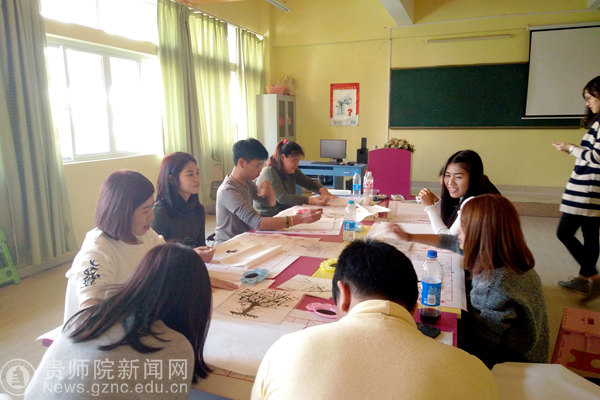 本网讯 12月12日,赴best365学习的泰国交换生在致远楼622教室学习中华才艺课程--吹墨画。