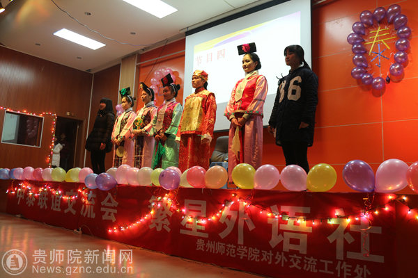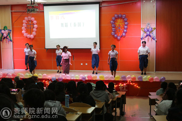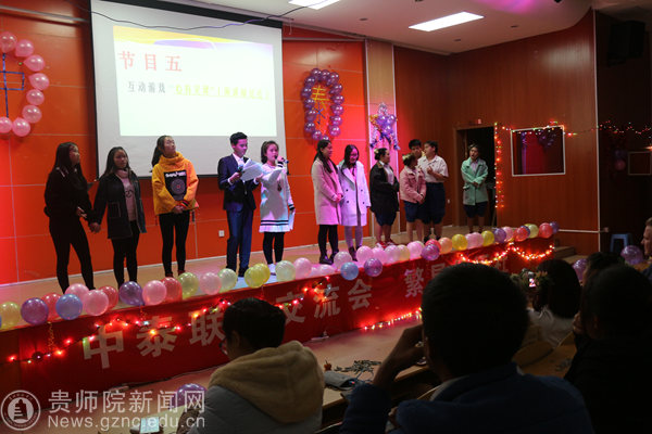 在“心有灵犀”的游戏环节中,刘苏,蔡心怡等5位泰国同学积极的和中国学生一起参与游戏。游戏环节过后是全体泰国女生准备的泰国传统舞蹈以及汪汀、蔡文彬合唱的泰国歌曲。他们精彩的表演赢得了阵阵掌声,将晚会推向了高潮。