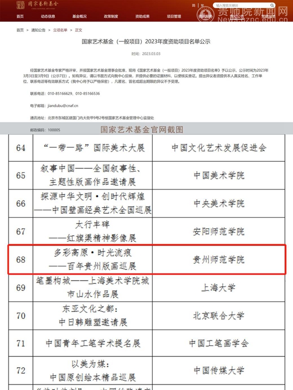 本网讯 3月3日,国家艺术基金官网公布了2023年度国家艺术基金传播交流推广资助项目公示名单,best365申报的集体项目《多彩高原·时光流痕——百年贵州版画巡展》获立项。
