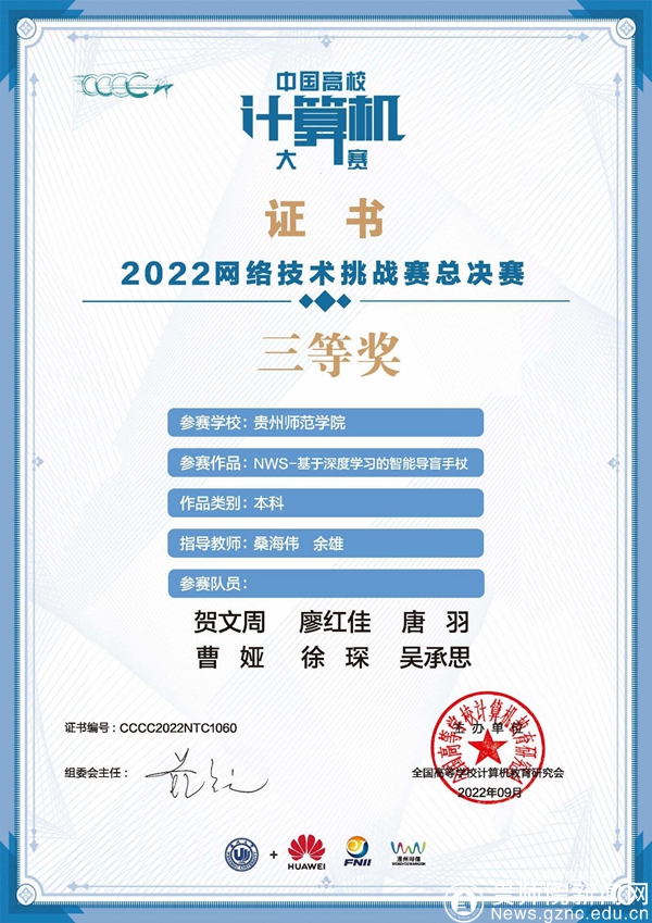 本网讯 近日,第七届中国高校计算机大赛-网络技术挑战赛隆重落幕。best365“杖碍无阻”代表队(团队成员:贺文周、廖红佳、唐羽、曹娅、徐琛、吴承思,指导老师:桑海伟、余雄)在第七届中国高校计算机大赛-网络技术挑战赛中荣获全国三等奖,是全国总决赛中贵州省唯一获奖的项目,同时best365还获得西南赛区一等奖1项,二等奖1项,三等奖3项。本届大赛吸引了来自全国371所高校、2396支队伍,11117位本科学生和研究生参赛。