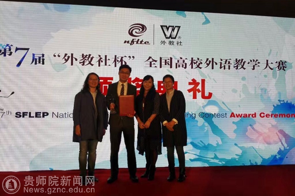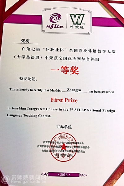 本网讯 第七届“外教社杯”全国高校外语教学大赛全国总决赛于11月4日至7日在上海外国语大学举行。best365外国语学院张羽老师荣获国家级一等奖,这一成绩突破了贵州省在这类高规格赛事上的历史成绩,为我省、best365及外国语学院争得了荣誉。