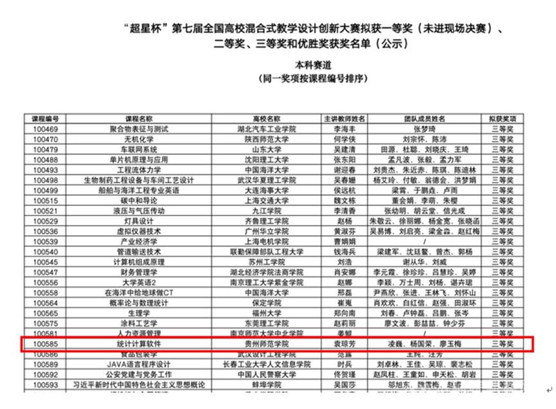 《统计计算软件》课程作为数学与大数据学院一门持续创新的标杆课程,课程近年来已连续荣获了第五届贵州省高校教师教学创新大赛省赛三等奖、第三届全国高校青年教师数据科学与商业分析案例教学竞赛总决赛一等奖等荣誉,本次在全国高校混合式教学设计创新大赛中再创佳绩,不仅是对课程团队既往创新成果的再次肯定,更标志着其教学改革进入了一个全新的发展阶段。课程团队表示,未来将继续以各类高水平教学竞赛为平台与契机,不断深化混合式教学模式的创新探索与推广应用,致力于让更优质的教学资源惠及广大学子,持续推动学院人才培养质量向更高水平攀登。