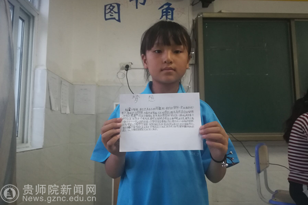 首先,志愿者由“莱特兄弟的飞翔梦”的小故事引出主题:莱特兄弟经过6年的时间,上千次万次的实验,终于实现了人类飞上蓝天的梦想。莱特兄弟的故事告诉我们想实现自己的梦想,不仅需要坚持,更需要不断地去实践才行。随后,志愿者用《中国合伙人》这部关于追逐梦想的励志电影,启发孩子们在追逐梦想时,道路必然是崎岖的,但未来必然是光明的,只要坚持、努力,结果是不会让你失望的。最后,志愿者向孩子们相互分享了自己的经历和感受,孩子们则通过日记的形式,记录下了心中小小的梦想。通过孩子们的文字,志愿者感觉离这些心灵纯洁但又敏感的孩子们更近了一步。