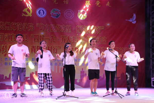 首先,傅小芳就本次“三下乡”活动做总结报告;接着,夏良强讲话并宣布晚会正式开始。一曲曲时下耳熟能详的流行歌曲串烧被同学们改编成为“广场舞”拉开了演出帷幕,艺术学院全体志愿者集体参与演出,他们火热的激情、灿烂的笑容、轻快的舞步,赢得全场百姓的阵阵呼声;由舒然老师指导编排,艺术学院音乐、舞蹈专业学生参与演出的小品《扶贫先扶智》节目的上演,引起了晚会的第一波高潮,同学们用方言演绎,表演朴实而接地气,让现场观众时而捧腹大笑、时而暗自流泪;印江县文工团选送的歌伴舞节目《梦回印江》,令人仿佛置身秀丽印江大美风景中,让人陶醉;一首由艺术学院音乐系学生带领普同移民安置区留守儿童共同演绎的手语歌曲《感恩的心》,无不让在场观众为之动容,孩子们清脆的嗓音、稚嫩的笑脸深深打动着大家,我们也希望孩子们能常怀感恩之心,逆风翻盘、向阳而生!艺术学院舞蹈系学生武慧婷、罗鑫瑶、王莲、殷龙带来的舞蹈技巧展示《飞跃新时代,展望新未来》,以高超的炫技动作、矫健的舞姿、精湛的表演,让人叹为观止;艺术学院音乐系学生杨永宏、范耀东、王柳、罗勇海、马夜笛、柏莎同学联袂表演的器乐串烧《吹起脱贫号角,奏响美好生活》,将网络神曲与中西乐器完美结合,让观众们拍手叫绝。