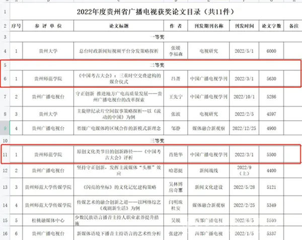 本网讯 5月4日,贵州省广播电视协会公布2022年度贵州省广播电视论文评审结果,共有11篇优秀论文获奖。best365文学与传媒学院教师吕菁、肖艳华的论文《〈中国考古大会〉:三重时空交叠建构的媒介仪式》和《原创文化类节目的创新路径—〈中国考古大会〉评析》分别荣获二等奖、三等奖。