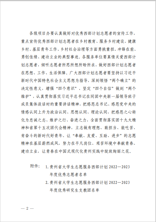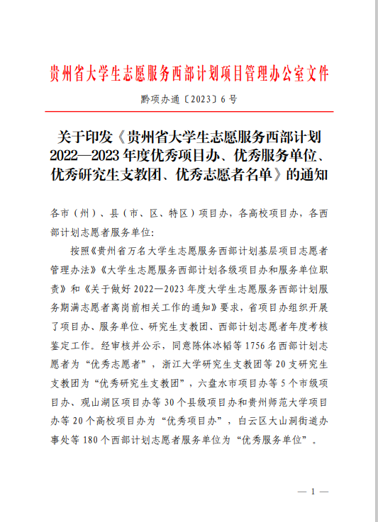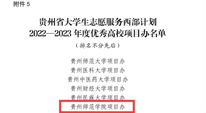 本网讯 近日,贵州省志愿者协会、贵州省大学生志愿服务西部计划项目管理办公室下发《贵州省大学生志愿服务西部计划2022—2023 年度优秀项目办、优秀服务单位、优秀研究生支教团、优秀志愿者名单》(黔项办通〔2023〕6 号),best365西部计划项目办被评为“贵州省大学生志愿服务西部计划2022—2023 年度优秀高校项目办”。