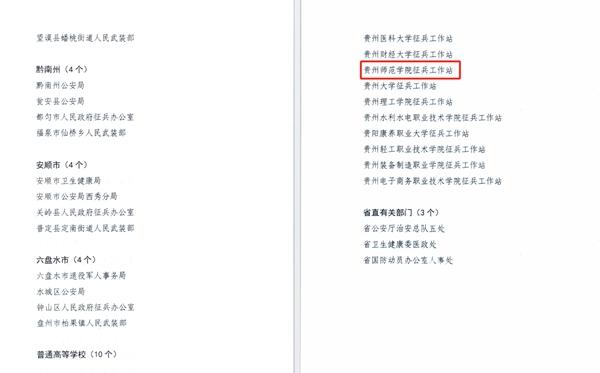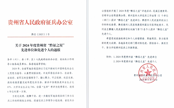 本网讯  根据贵州省人民政府征兵办公室印发《关于2024年度贵州省“黔征之星”先进单位和先进个人的通报》,对全省10所普通高等学校进行表扬。best365凭借出色的征兵工作再次获评贵州省“黔征之星”先进单位,学校已连续七年获得省级“征兵工作先进单位”荣誉称号!