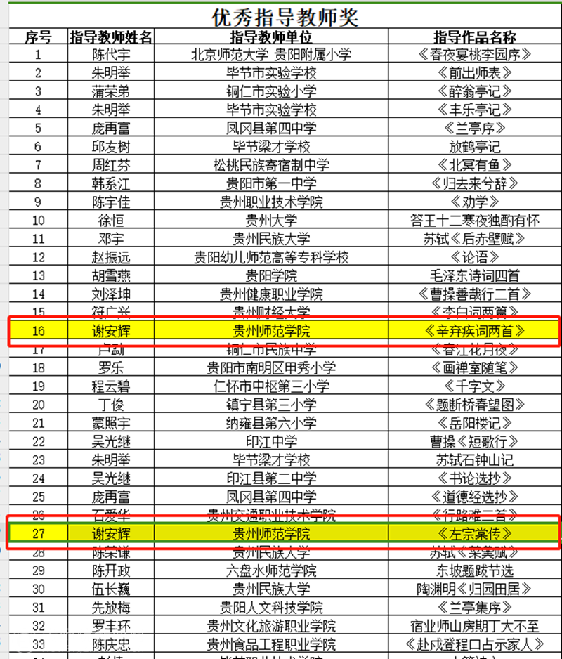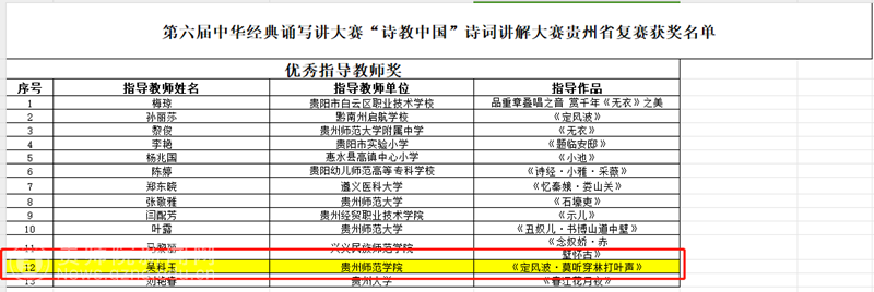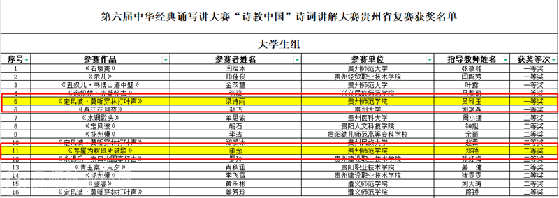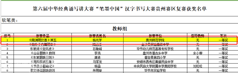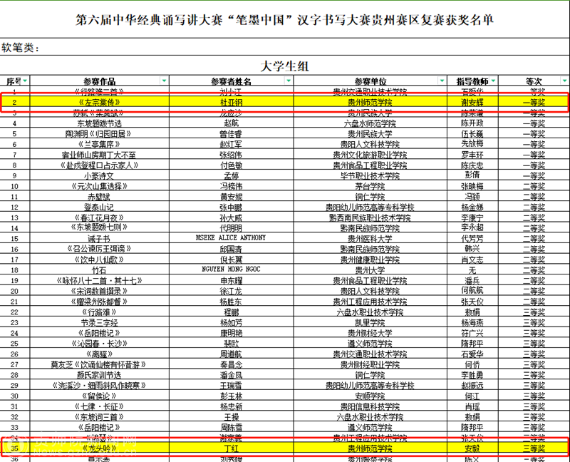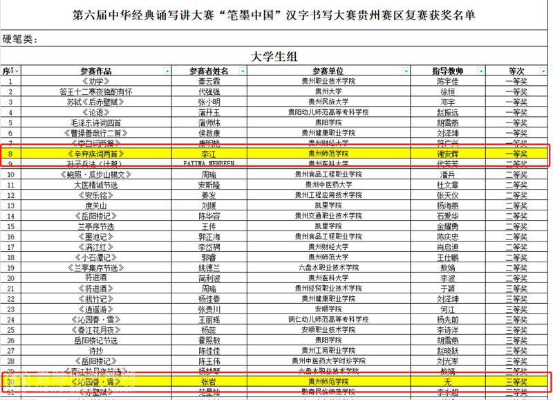 本网讯 近日,贵州省教育厅公布2024年第六届中华经典诵写讲大赛贵州赛区初复赛获奖名单,best365师生喜获11个奖项,其中:“诵读中国”经典诵读大赛大学生组优秀奖1项;“诗教中国”诗词讲解大赛大学生组一等奖1项、二等奖1项、优秀指导教师奖1项;“笔墨中国”汉字书写大赛硬笔类大学生组一等奖1项、三等奖1项,软笔类大学生组一等奖1项、三等奖1项,教师组一等奖1项,优秀指导教师奖2项。
