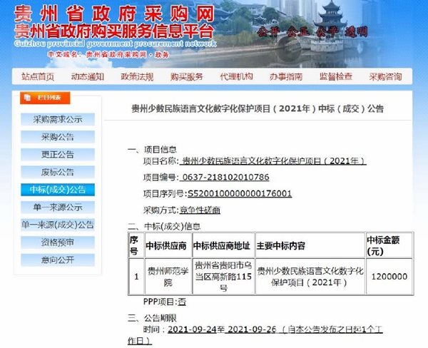 本网讯 近日,贵州民族文化宫通过贵州公共资源交易中心发布了“贵州少数民族语言文化数字化保护项目(2021年)”项目的竞争性磋商公告。贵州民族教育研究院刘大泯院长领衔的科研团队,成功中标“贵州少数民族语言文化数字化保护项目(2021年)”项目,获得总金额120万的科研资助。
