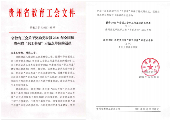 本网讯 12月20日,贵州省教育工会传来喜讯,学工部“书香茶吧”职工书屋被评为“全国职工书屋”,并获赠相关配套图书600余册。
