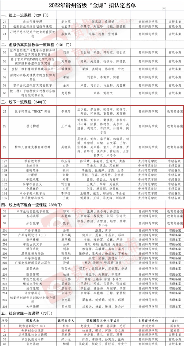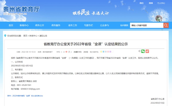 本网讯 8月10日至8月16日,贵州省教育厅对2022年省级“金课”认定结果进行了公示,拟认定全省高校共928门本科课程为省级“金课”。best36544门课程获得认定,其中线上课程3门,线下课程12门,线上线下混合式课程19门,虚拟仿真课程6门,社会实践课程4门。截至目前,best365共有国家级一流课程(创新创业训练营)1门,教育部备案线下一流课程3门和线上线下混合式一流课程3门。