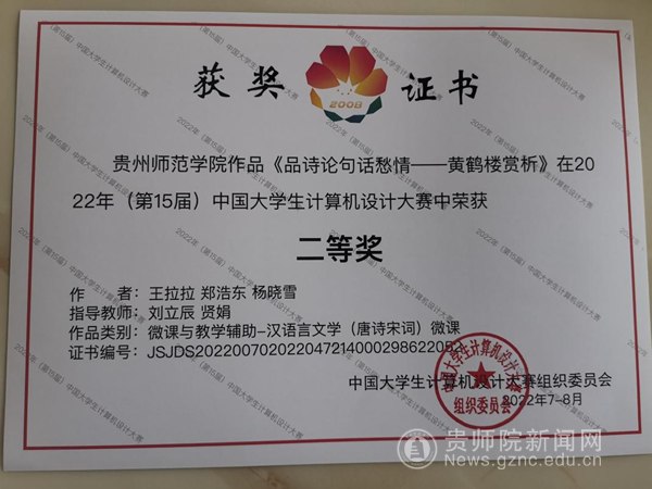本网讯 近日,第十五届中国大学生计算机设计大赛落下帷幕。经过激烈角逐,由我院教师刘立辰、贤娟指导,王拉拉、郑浩东、杨晓雪三位同学共同创作的微课作品《品诗论句话愁情——黄鹤楼赏析》,斩获“微课与教学辅助”类国家级二等奖。