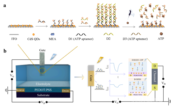 如图1所示,在CdSQDs/ITO栅电极上建立了具有高负电荷的超分子DNA结构通过酰胺化将5′-胺化的DNA 1 (ATP aptamer,记为D1)功能化到羧化的CdS量子点上,随后的DNA自组装在特定区域部分识别的重复序列DNA 2 (记为D2)和DNA 3 (ATP aptamer,记为D3)。经过ATP处理将解离连接的DNA链,释放D2和D3,极大地降低了负电荷密度同时使得(3,4乙二氧基噻吩基):聚(苯乙烯磺酸)(PEDOT:PSS)通道在光照下具有良好的传输特性。开发的新型有机光电化学生物传感系统不仅完成了光电接口与靶标相关的超灵敏度调谐,而且还将成为未来OPECT调控和操作的一种新型传感分析方法。