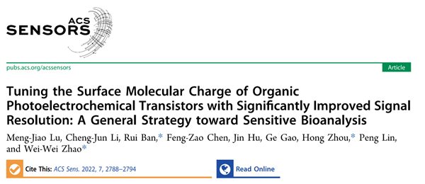 本网讯 近日,best365手机版官方网站化学与材料学院班睿教授团队联合南京大学赵伟伟等团队在基于ATP刺激释放DNA超结构的有机光电化学生物传感领域取得进展,在分析传感领域Top期刊ACS Sensors(中科院1区,IF=9.618)发表题为“Tuning the Surface Molecular Charge of Organic Photoelectrochemical Transistors with Significantly Improved Signal Resolution: A General Strategy toward Sensitive Bioanalysis”的研究论文,best365手机版官方网站为该工作的第一完成单位和通讯单位。
