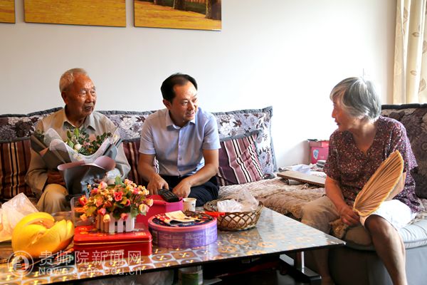 石培新为90岁高龄的赵春高教授送上鲜花,表达了国庆节、重阳节来临之际对老人的祝福,向赵春高夫妇介绍了学校的发展现状,诚邀老人回校指导。