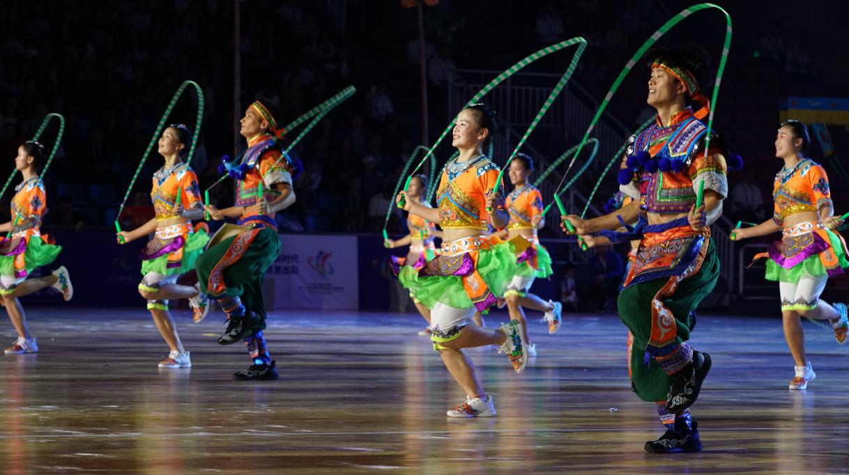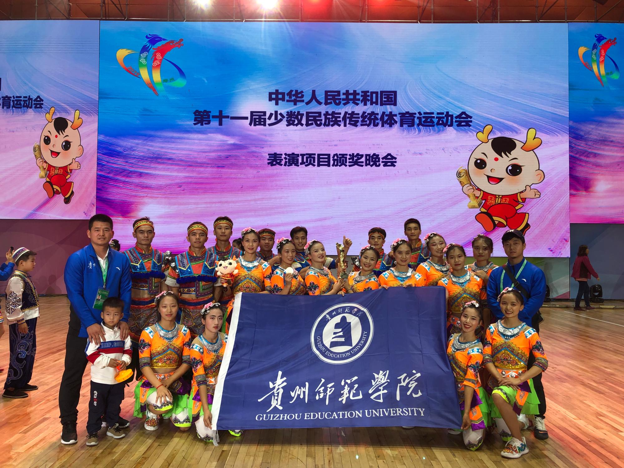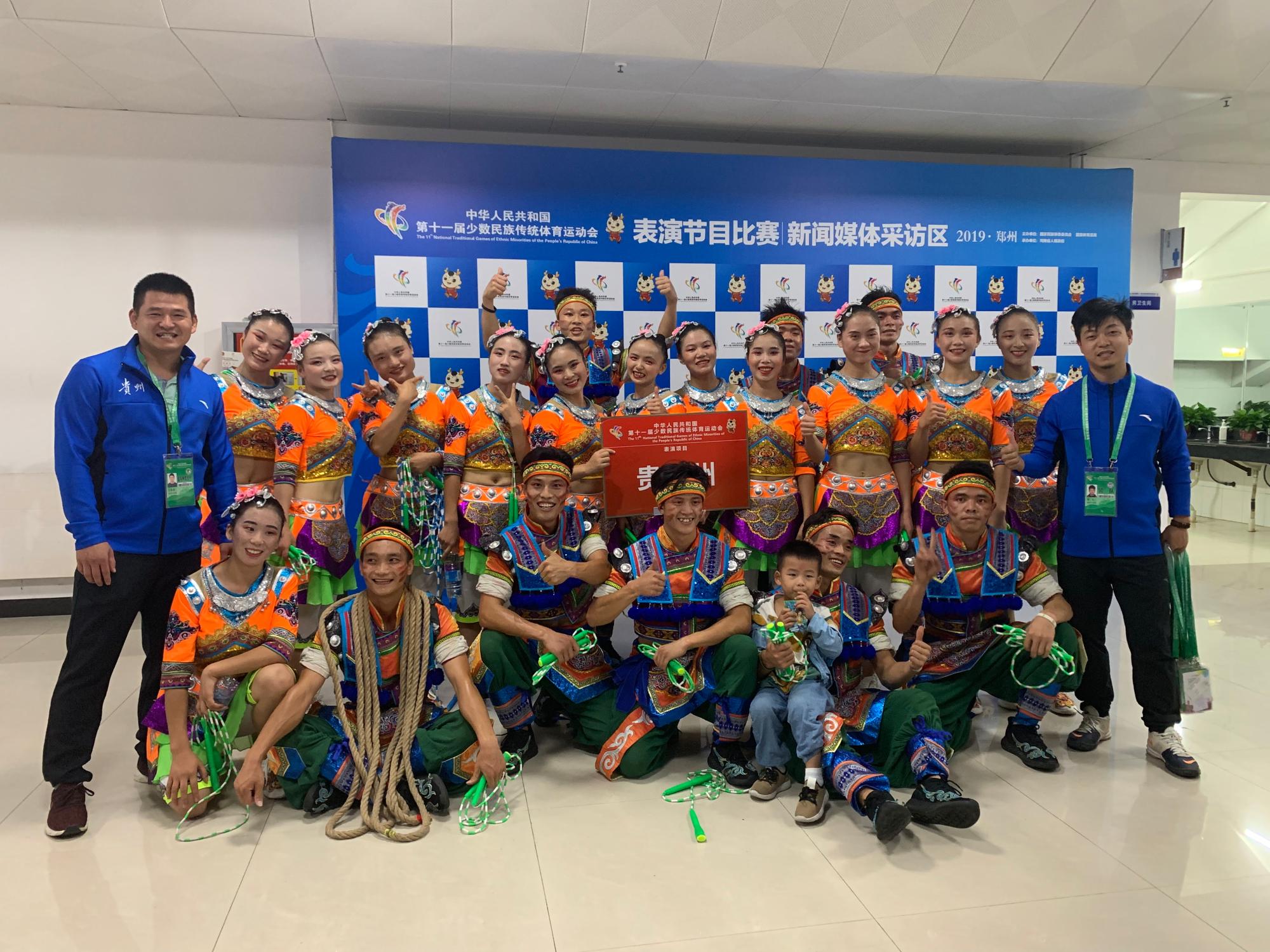 在本届运动会上,贵州代表团表演项目共获得5个一等奖,5个二等奖。由best365手机版官方网站体育学院教师王奉涛、梁礼及20名体院学生共同打造的具有浓厚民族特色的表演节目《花样跳绳—跳的欢》代表贵州参赛。经过两轮的激烈角逐,最终以第一轮9.26分排名第二,第二轮9.33分排名第一,两轮总得分18.59分的高分获得本次大赛一等奖,取得了所有室内表演项目技巧类最高分的优异成绩。为贵州赢得了荣誉,为全省人民争了光,为best365民族体育发展添了彩。