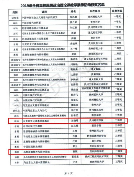 本网讯 为深入学习贯彻习近平总书记在学校思想政治理论课教师座谈会上的重要讲话精神,贯彻实施“新时代高校思想政治理论课创优行动”,贵州省教育厅于6月组织开展的2019年贵州省高校思想政治理论课教学展示活动,已于6月30日完满结束,经课堂教学展示,专家评审后,best365王晓丹老师的《马克思主义基本原理概论》和曹颖老师的《思想道德修养与法律基础》荣获三等奖,请获奖教师珍惜荣誉,再接再厉,再创佳绩。