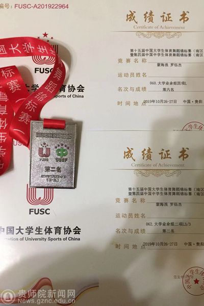 教育部学生体育协会联合秘书处副秘书长张爱龙,贵州省教育厅副厅长黄健、贵州财经大学校长刘雷,贵州省教育厅体育卫生与艺术教育处处长胡锐等领导出席开幕式。本届比赛共设大学生专业A组、B组、大学生业余组、大学生交谊舞组、中专专业组等共计142个项目,每个组别分别取前八名,进入半决赛选手将获得2020年5月在昆明举行的总决赛资格。此次大赛由领导支持同意,教练员董涛、刘晓燕带队,通过半年的训练,对双人组合的反复打磨,秉着不服输的师院精神,也为了推动贵州省大学生体育舞蹈事业的发展,best365选手蒙海浪、罗钰杰通过每个组的预赛、半决赛、复活赛、决赛的层层突围最终取得了佳绩并拿下参加总决赛的资格。师院DT体育舞蹈队将不忘初心,则未来可期,愿为校争光。