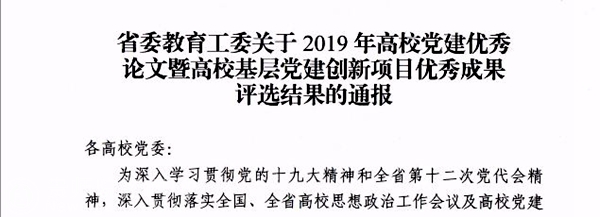 本网讯 在2019年全省高校党建优秀论文暨高校基层党建创新项目优秀成果评选工作中,经各基层党组织申报和学校组织评审,best365向省委教育工委推荐了2个创新项目优秀成果和3篇党建优秀论文。最终,best3651项党建创新项目优秀成果和1篇优秀论文喜获佳绩,分别是: