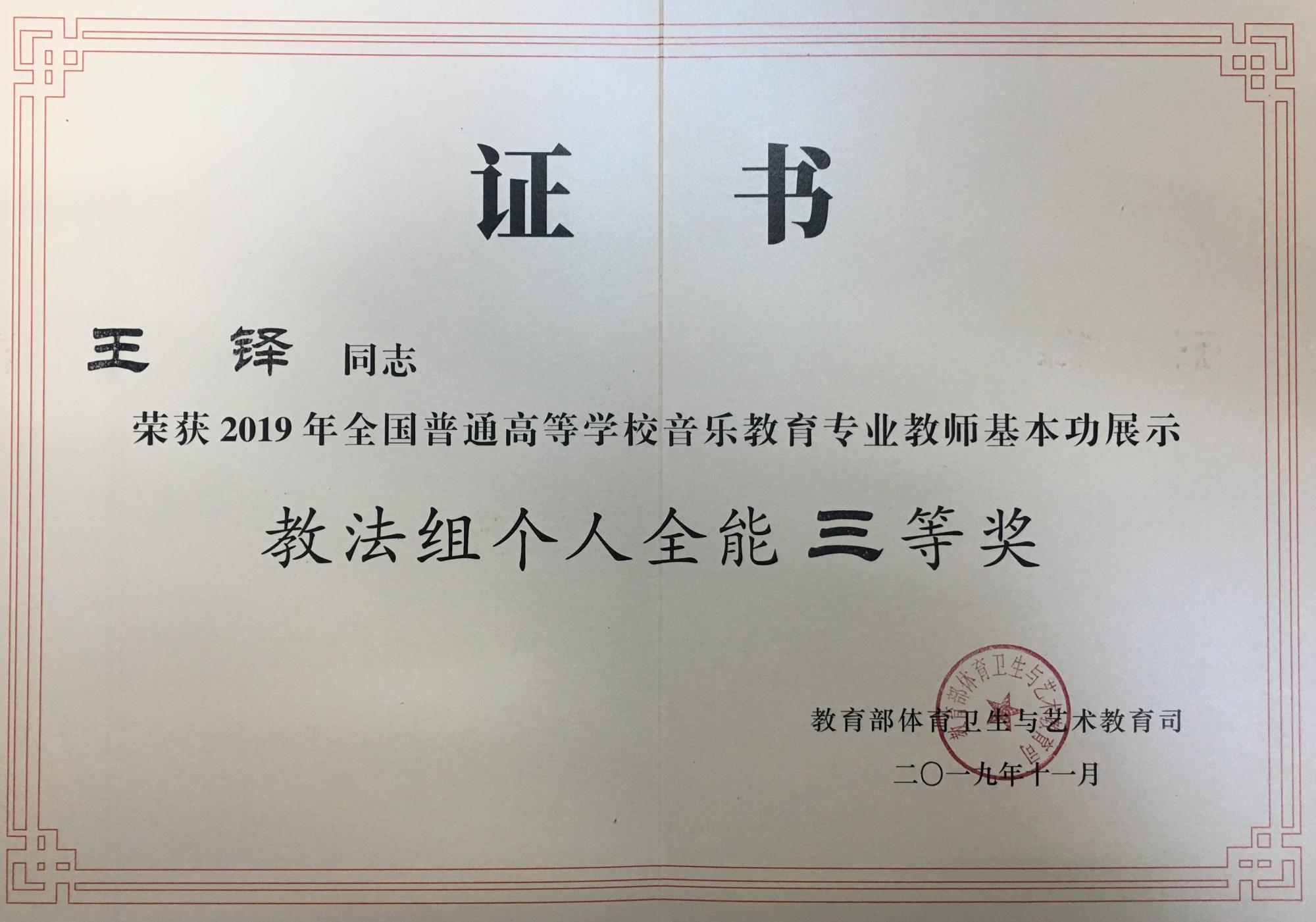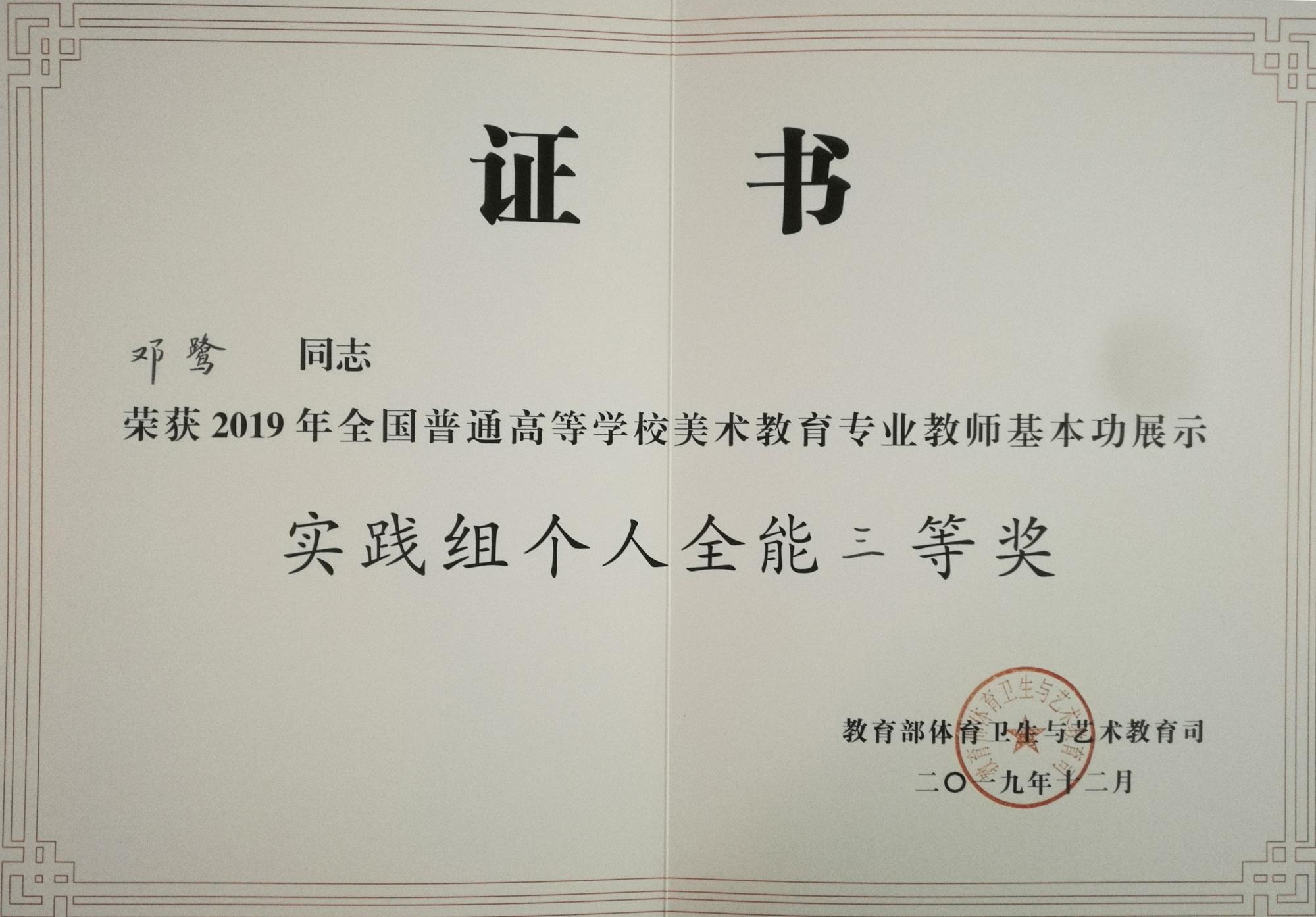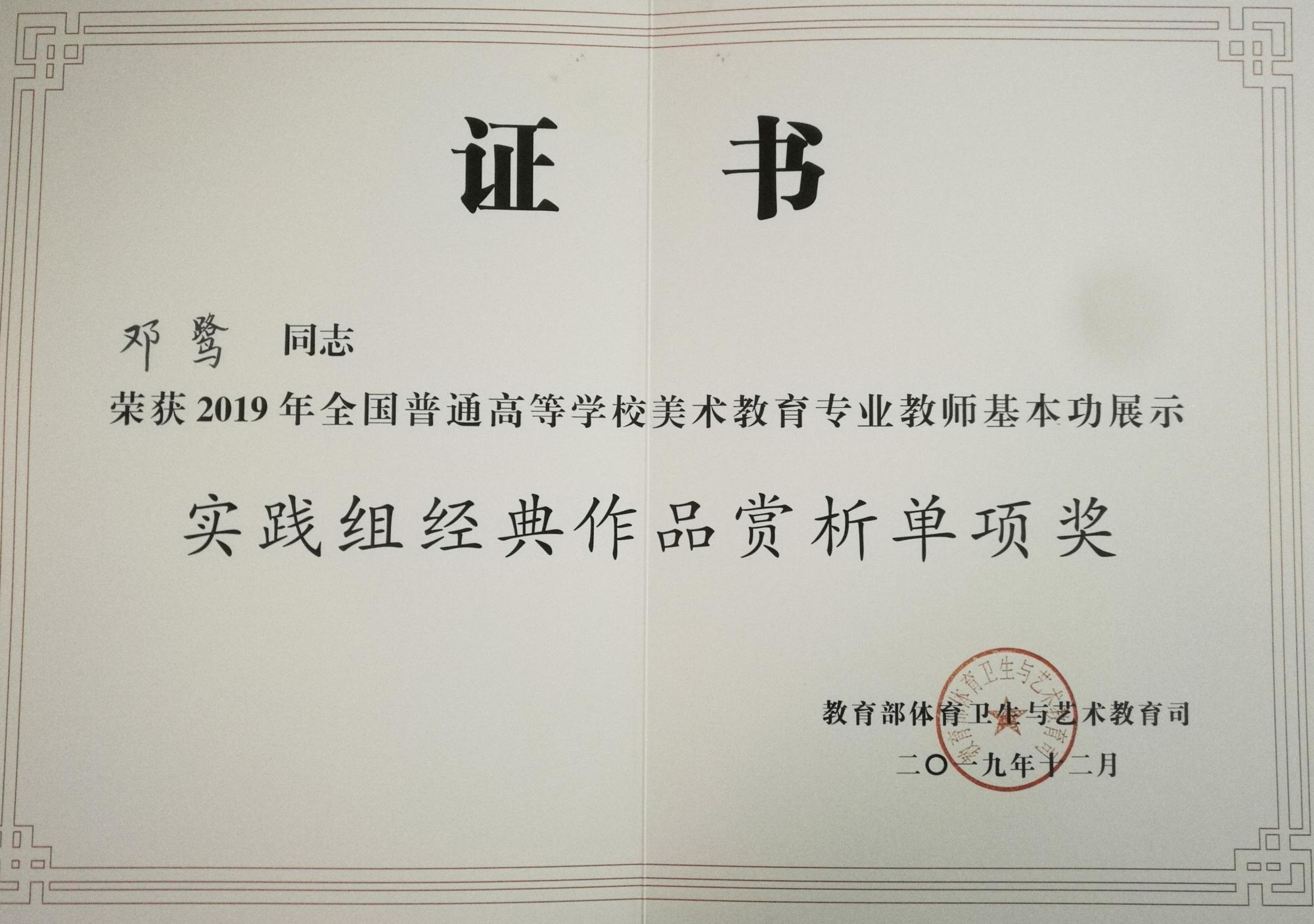 本网讯 日前,教育部公布了2019年全国高校音乐美术教育专业教师基本功展示评选结果,贵州省共获得6个奖项,其中美术类2个、音乐类4个。best365教师共获得其中4个奖项:美术与设计学院邓鹭教师在美术专业教师基本展示中获得个人全能奖实践组三等奖、个人单项奖实践组经典作品赏析单项奖;音乐与舞蹈学院王铎老师在音乐专业师基本展示中获得个人全能奖教法组三等奖、个人单项奖教法组专业展示单项奖。
