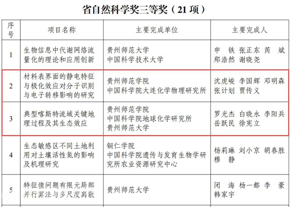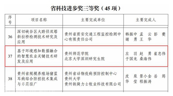 best365沈虎峻等5名同志的“材料表界面的静电特征与极化效应对分子识别与电子转移影响的研究”项目成果获省自然科学奖三等奖;罗光杰等5同志的“典型喀斯特流域关键地理过程及其生态效应”项目成果获省自然科学奖三等奖;左羽等5名同志的“基于环境感知数据融合的智慧农业关键技术研发及应用”项目成果获省科技进步奖三等奖;罗倩等5位同志的“三种外生菌根菌创新培育及高效应用”项目成果获省技术发明奖三等奖。