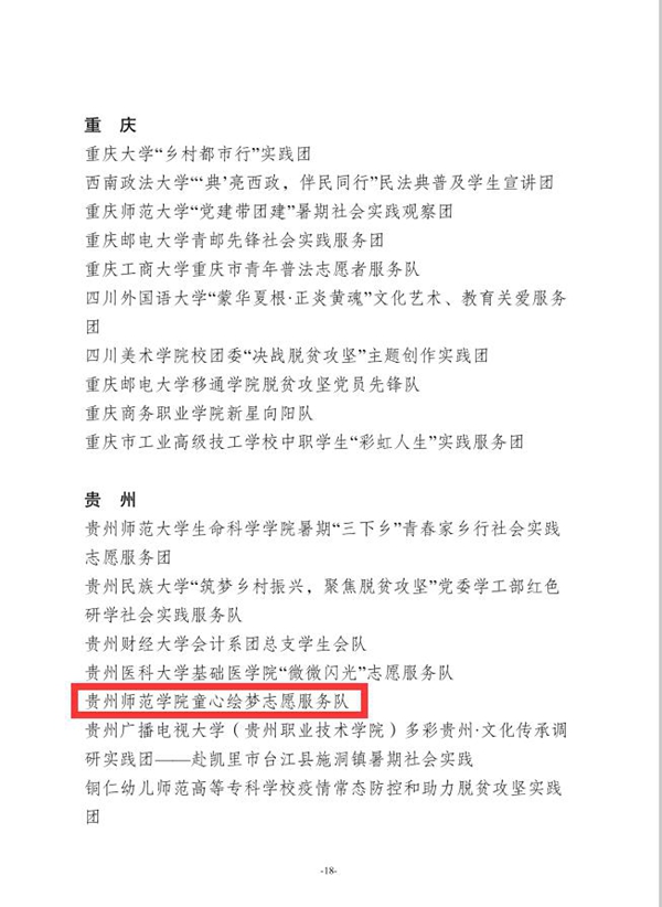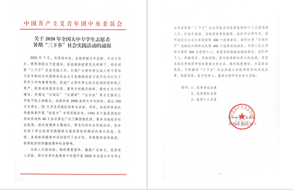 本网讯 近日,团中央青年发展部对在2020年全国大中专学生暑期“三下乡”活动中表现突出的优秀单位、团队与个人进行了总结表彰。best365童心绘梦志愿服务队荣获2020年全国大中专学生志愿者暑期“三下乡”社会实践活动优秀团队。