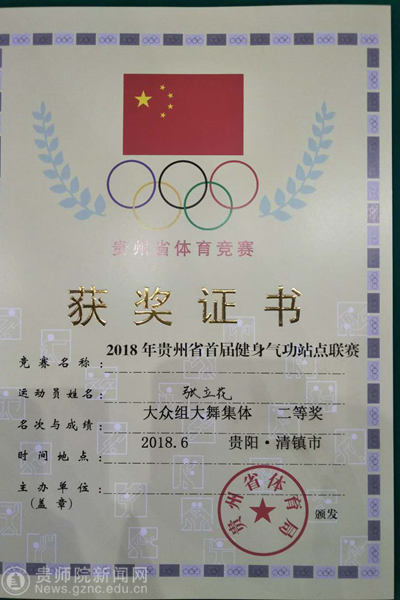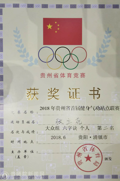 best365体育学院2016级体育教育专业学生张立花,应邀作为四名运动员之一,代表健身气功示范区---乌当区参加了此次比赛。经过激烈角逐,张立花同学先后荣获了健身气功·八段锦大众组集体一等奖、健身气功·大舞集体二等奖、健身气功·六字诀个人一等奖的好成绩。