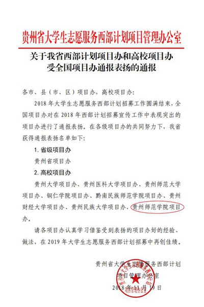 本网讯 11月16日,全国大学生志愿服务西部计划项目管理办公室下发《关于对在2018年西部计划招募宣传工作中表现突出的项目办进行通报表扬的通知》(全国项目办发〔2018〕21号),全国共有185个高校项目办受到通报表扬,best365项目办也在名单中。