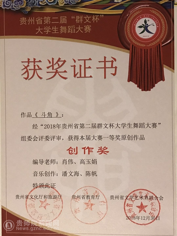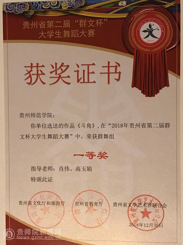 本网讯 4月25日,由贵州省文化和旅游厅、贵州省教育厅、贵州省文学艺术界联合会联合主办;贵州省文化馆、贵州省舞蹈家协会承办的贵州省第二届“群文杯”大学生舞蹈的比赛中,我院战绩累累。