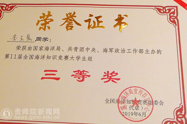 本网讯 生命在于运动,青春在于拼搏。我院2018级应用生物科学专业(2)班的李玉晨同学,经过层层选拔,进入到由国家海洋局、共青团中央、海军政治工作部主办的第11届全国海洋知识竞赛大学生组总决赛。总决赛于5月30号在海南省三亚市拉开帷幕,经过紧张激烈的比赛,最终李玉晨同学取得大学生组三等奖的优异成绩。