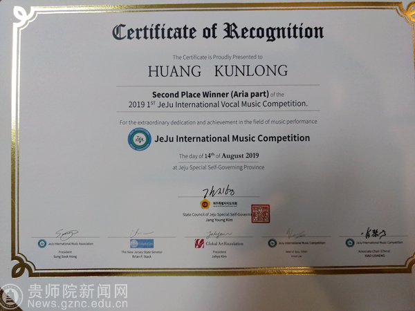 本网讯 8月14日晚,第二届济州国际音乐比赛暨首届济州国际声乐大赛颁奖典礼在美丽的汉拿大学艺术厅隆重举办。济州特别自治省政府国会议员Jang Yong Kim 代表省政府依次为获奖选手颁奖,并与获奖选手及市民朋友一起欣赏了专家评审代表、优秀选手及西归浦市中学生管弦乐团的精彩演出。best365音乐舞蹈学院2015级学生黄坤龙参与比赛并荣获歌剧咏叹调组二等奖。