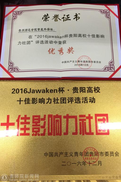 本网讯 近日,由中国共产主义青年团贵阳市委员会主办的“2016jawaken杯贵阳高校十佳影响力社团”评选活动结果揭晓。我院繁星外语社从全市190个社团中脱颖而出,荣获“十佳影响力社团”的荣誉称号。