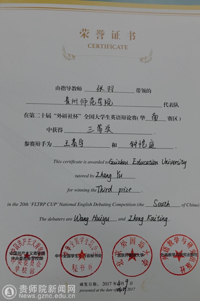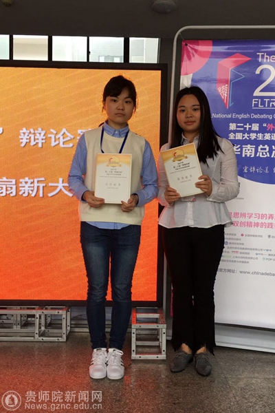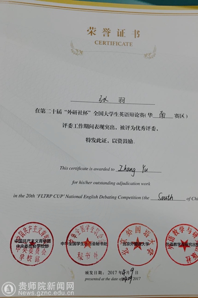本网讯 第二十届“外研社杯”全国大学生英语辩论赛(FLTRP Cup National English Debating Competition)华南赛区比赛于4月7日至9日在湖北黄冈师范学院隆重举行。best365英语辩论队15级英语专业钟恺庭、王荟宇两位同学代表best365参赛,最终荣获华南赛区三等奖。best365英语演讲与辩论社教练张羽老师受组委会邀请担任评委,评审期间兢兢业业,专业水准高,获“优秀评委奖”(Outstanding Adjudication Award)及指导教师三等奖两项荣誉。